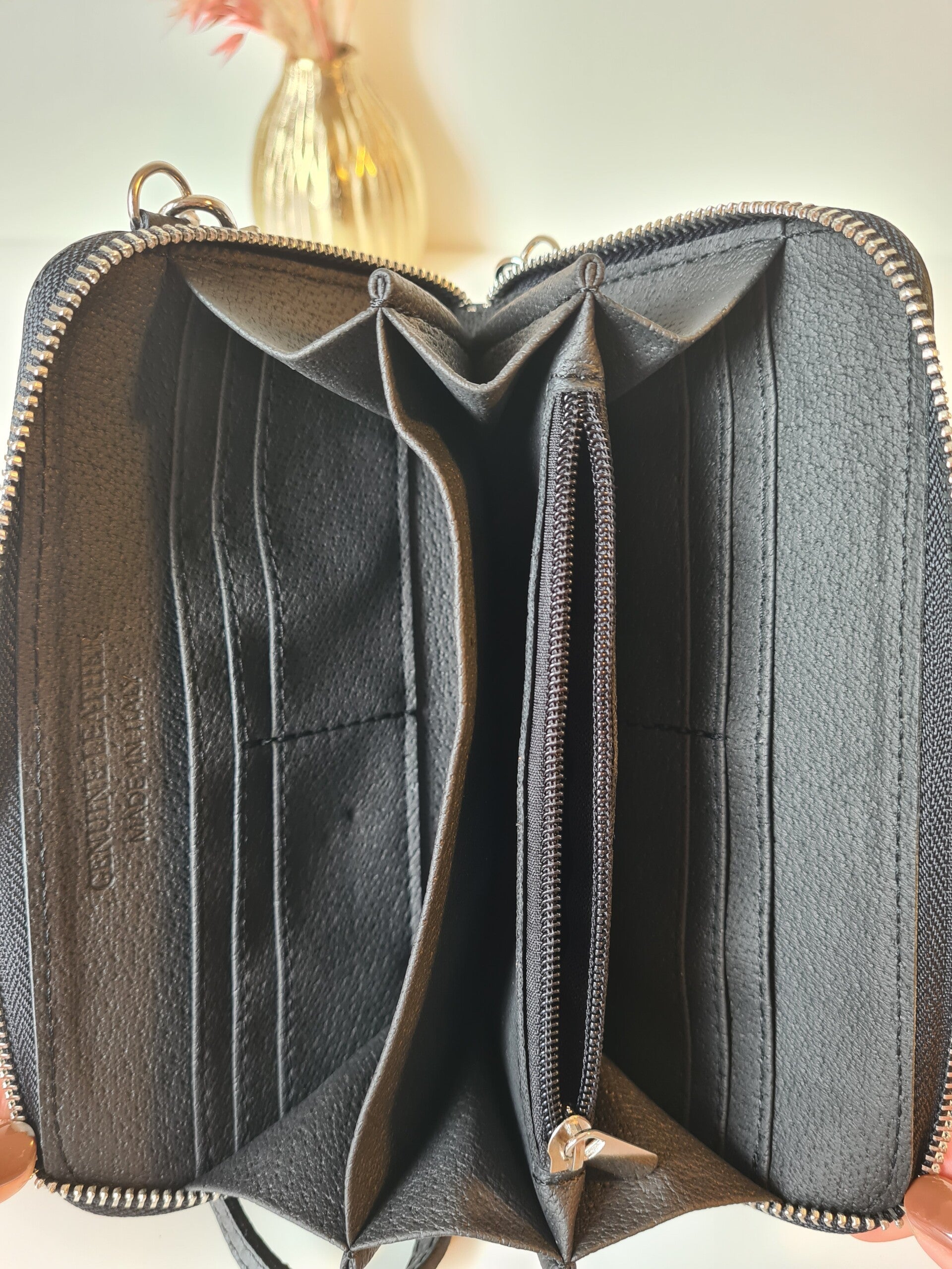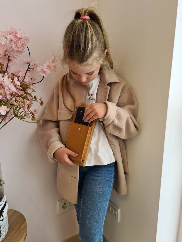 Lederen portefeuille met gsm vakje en lange riem.