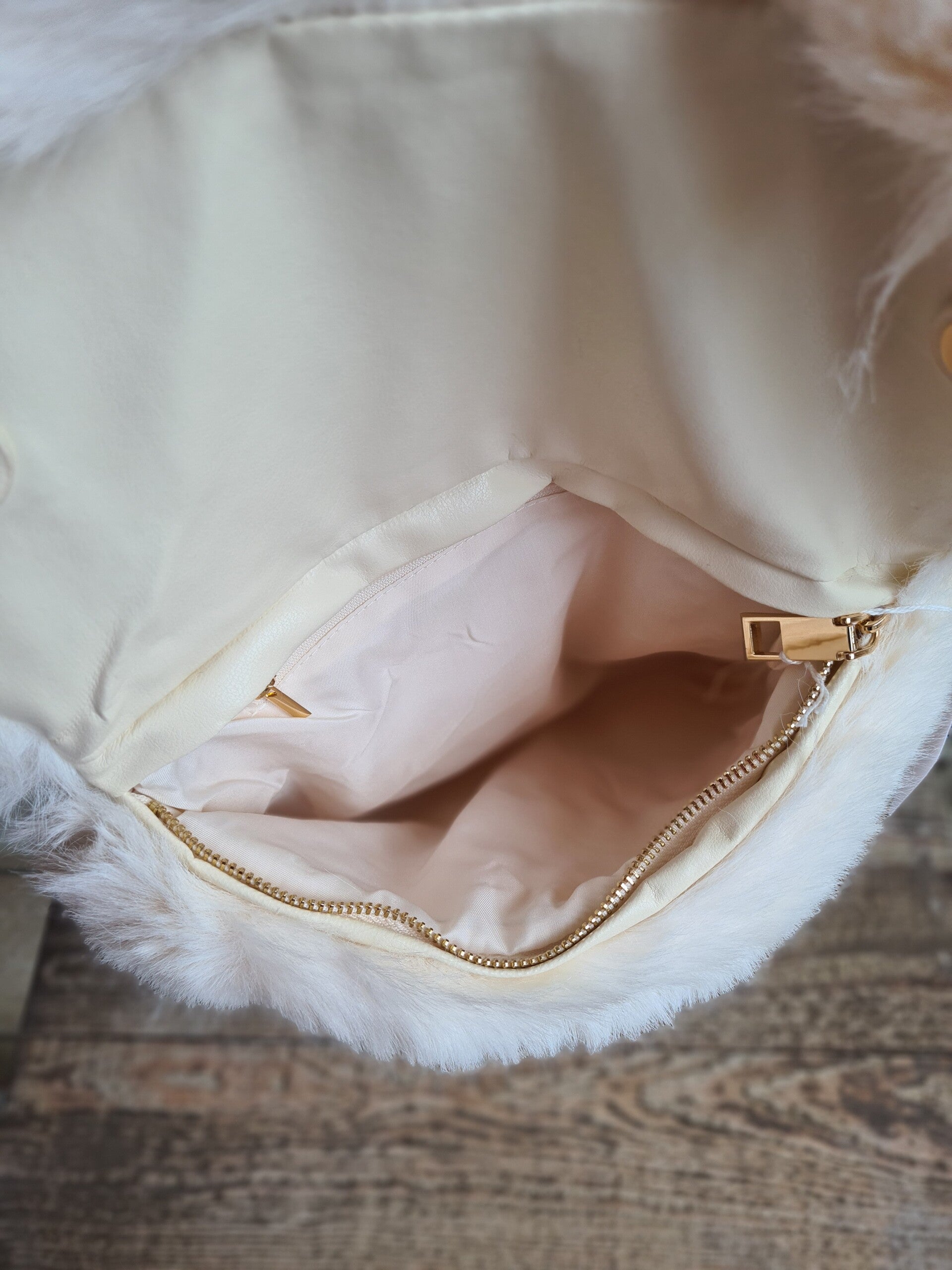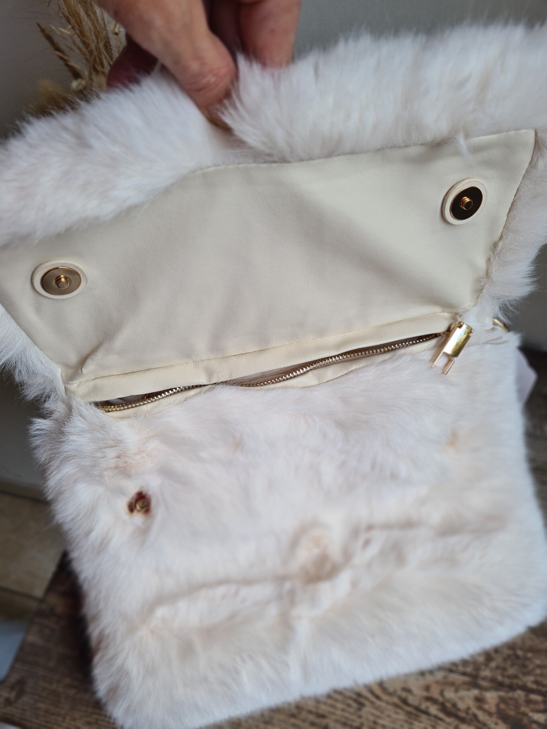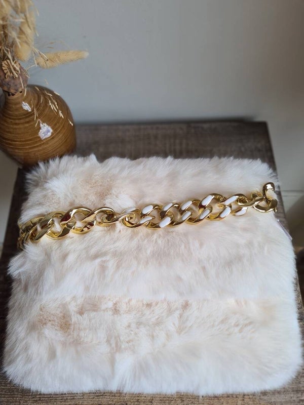 Enveloppe tas in zachte bont,met korte fantasieriem en lang goudkleurig riempje.